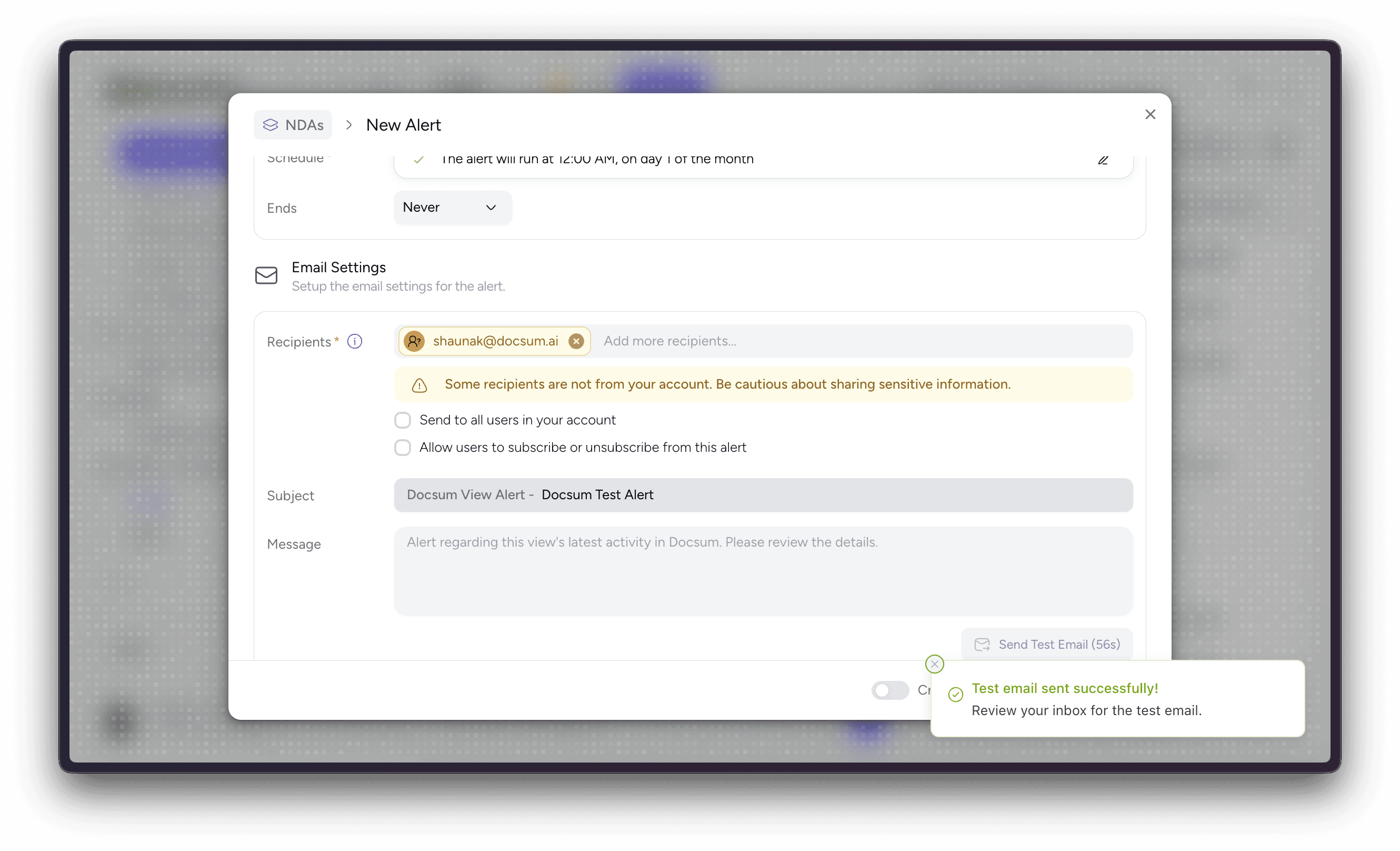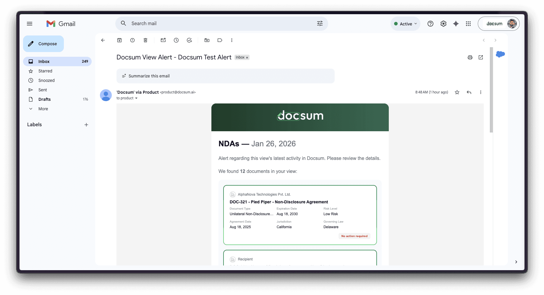 Your saved Views already filter contracts the way you need them. Now you can attach alerts to any View and let Docsum notify the right people automatically.
