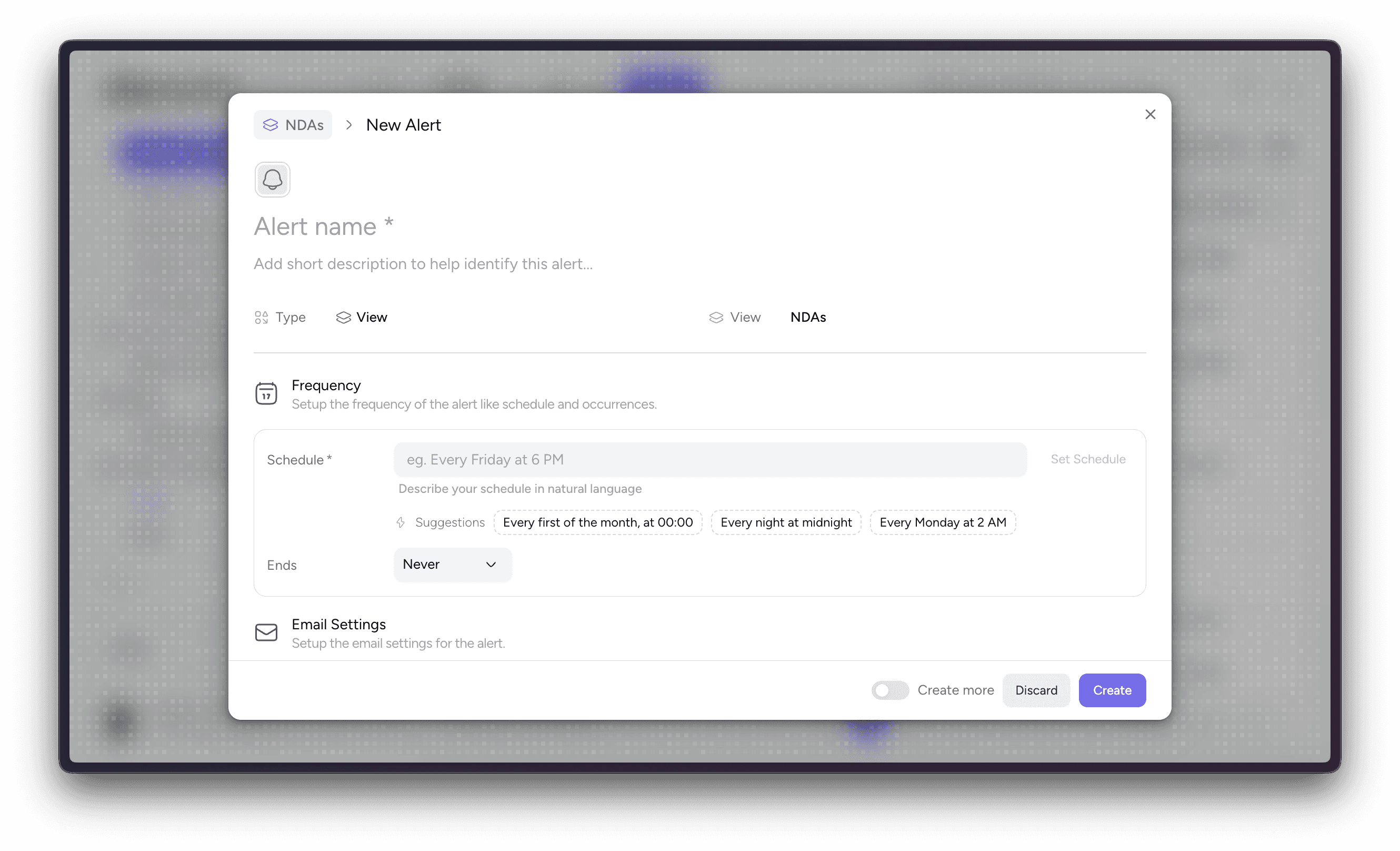 Easily create new alerts for any configured view. Use natural language to describe the alert frequency, recipients, and message.