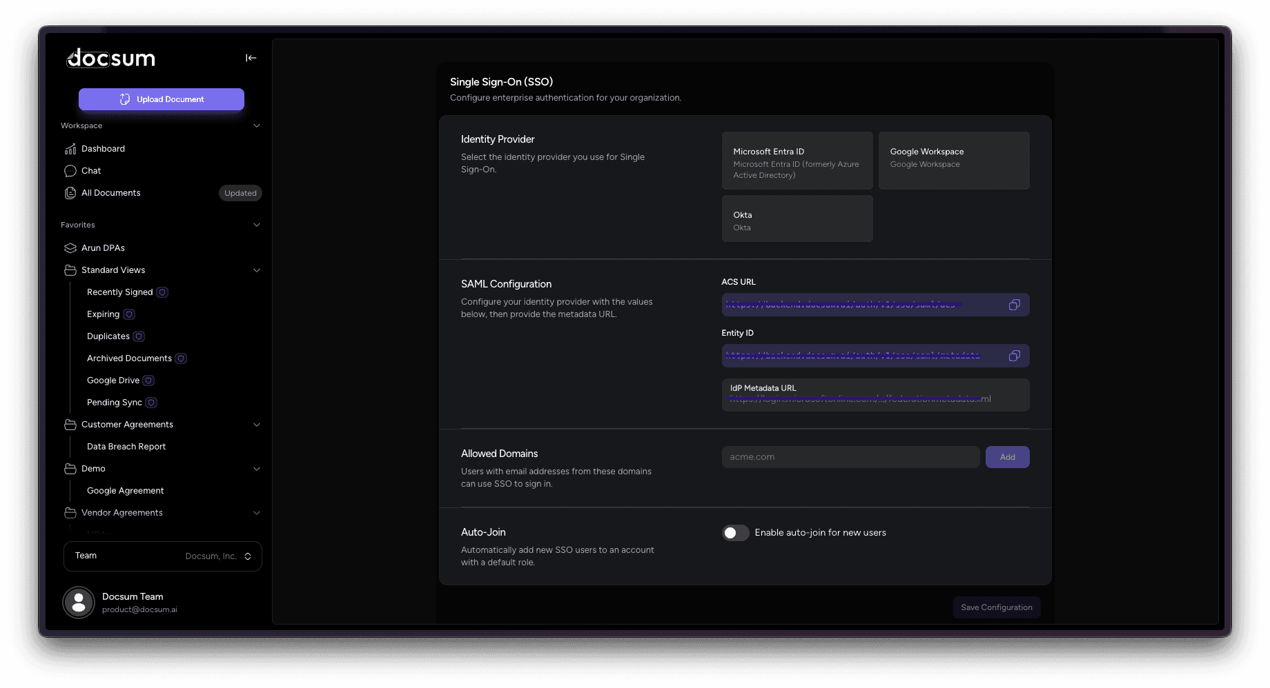Account admins can now configure SSO directly from Account Settings. The new setup wizard walks through provider configuration, domain management, and auto-join settings—no engineering help required.