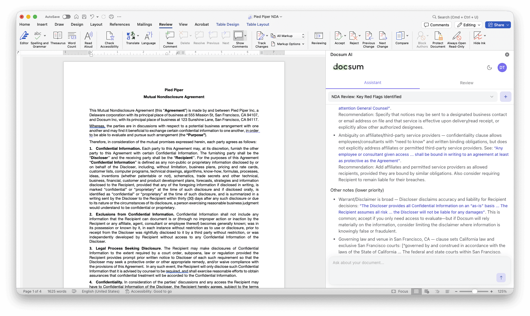 No more wondering where an answer came from. Click the citation, jump to the paragraph, and verify in seconds. In our next release, you'll be able to generate redlines and apply them directly to the document from chat.
