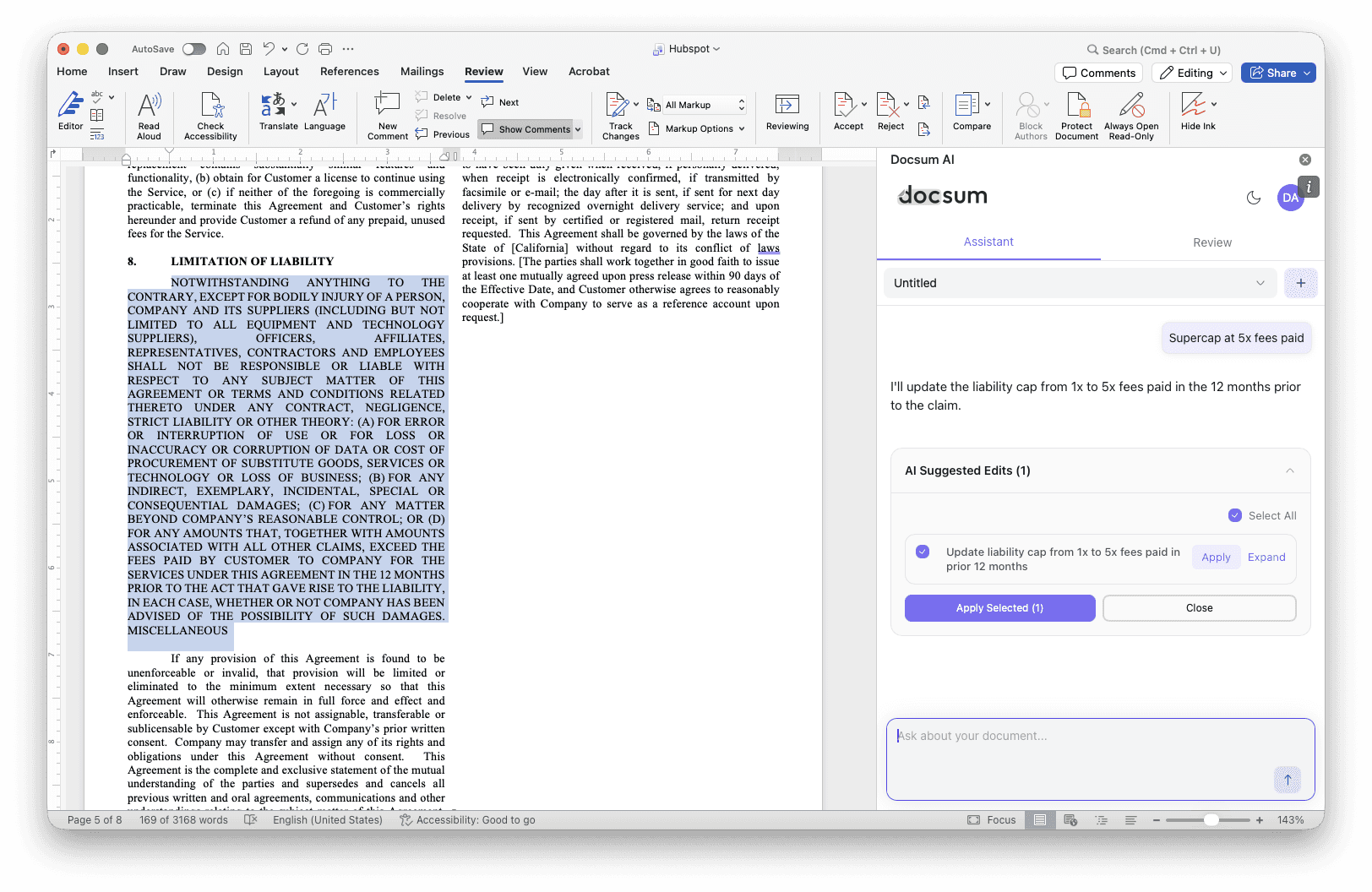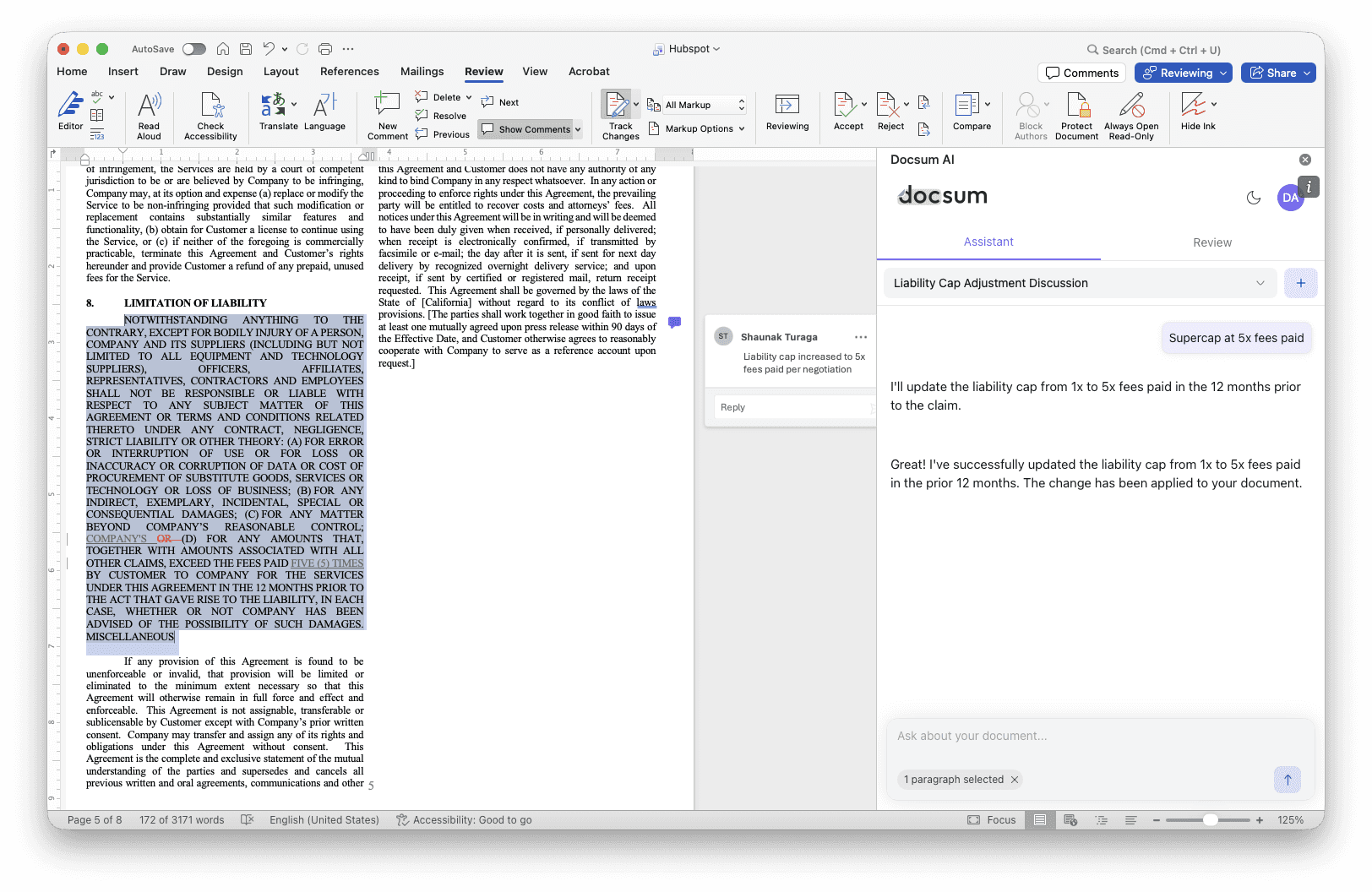 The Docsum Word Add-in now goes beyond review and chat. With the new AI Contract Editing tool, you can leverage AI assistance to draft, revise, and refine contract language directly within Microsoft Word. Combined with improved comment attribution via Office User Identity, your playbook-driven review workflows now properly track who suggested what—keeping your negotiation history clean and auditable.