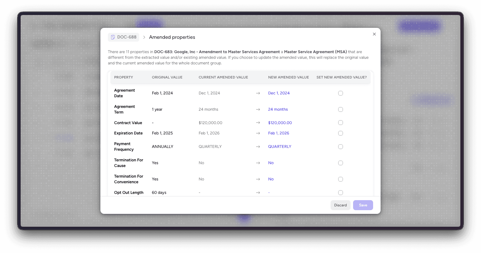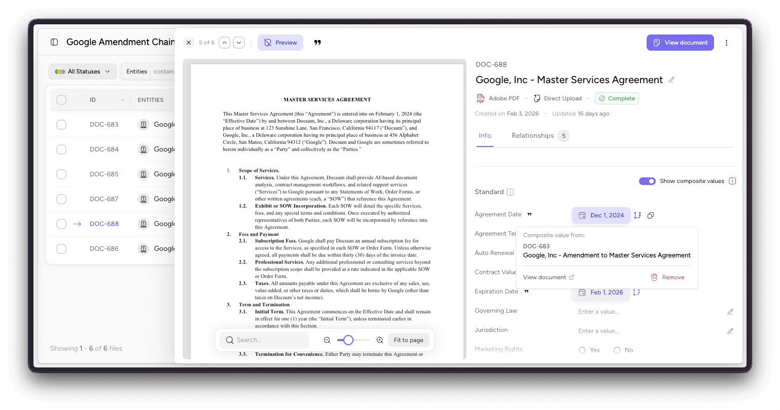 Composite values. View rolled-up data across related documents directly on the document sheet. Toggle between a document’s own extracted values and the composite view that accounts for amendments and related agreements—giving you the true, current state of any deal.