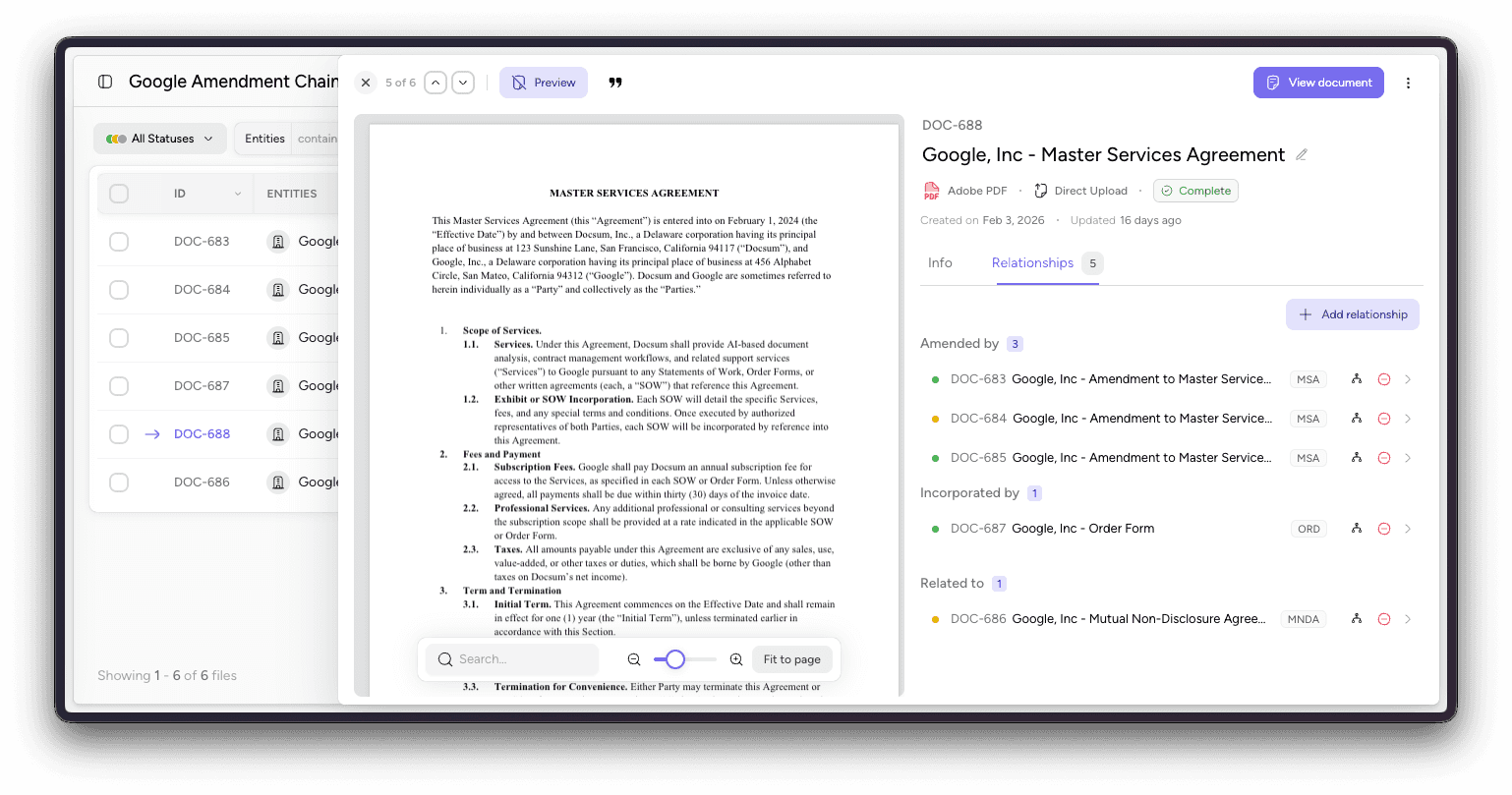 Contracts exist in webs of relationships: an MSA connects to its SOWs, amendments modify original terms, and renewals extend agreements. Until now, these connections lived in your team’s institutional knowledge. Docsum now lets you map them explicitly using a purpose-built graph database, giving you a structured, navigable view of how every document in your portfolio connects.