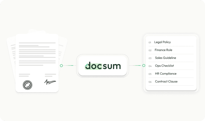 Build playbooks in minutes from your base templates and precedents by hooking into your Repository. Docsum transforms your institutional knowledge into consistent, automated reviews—without lengthy onboarding.