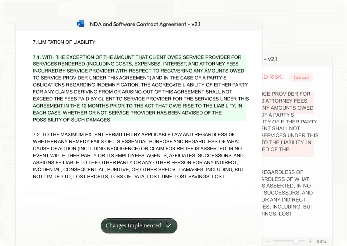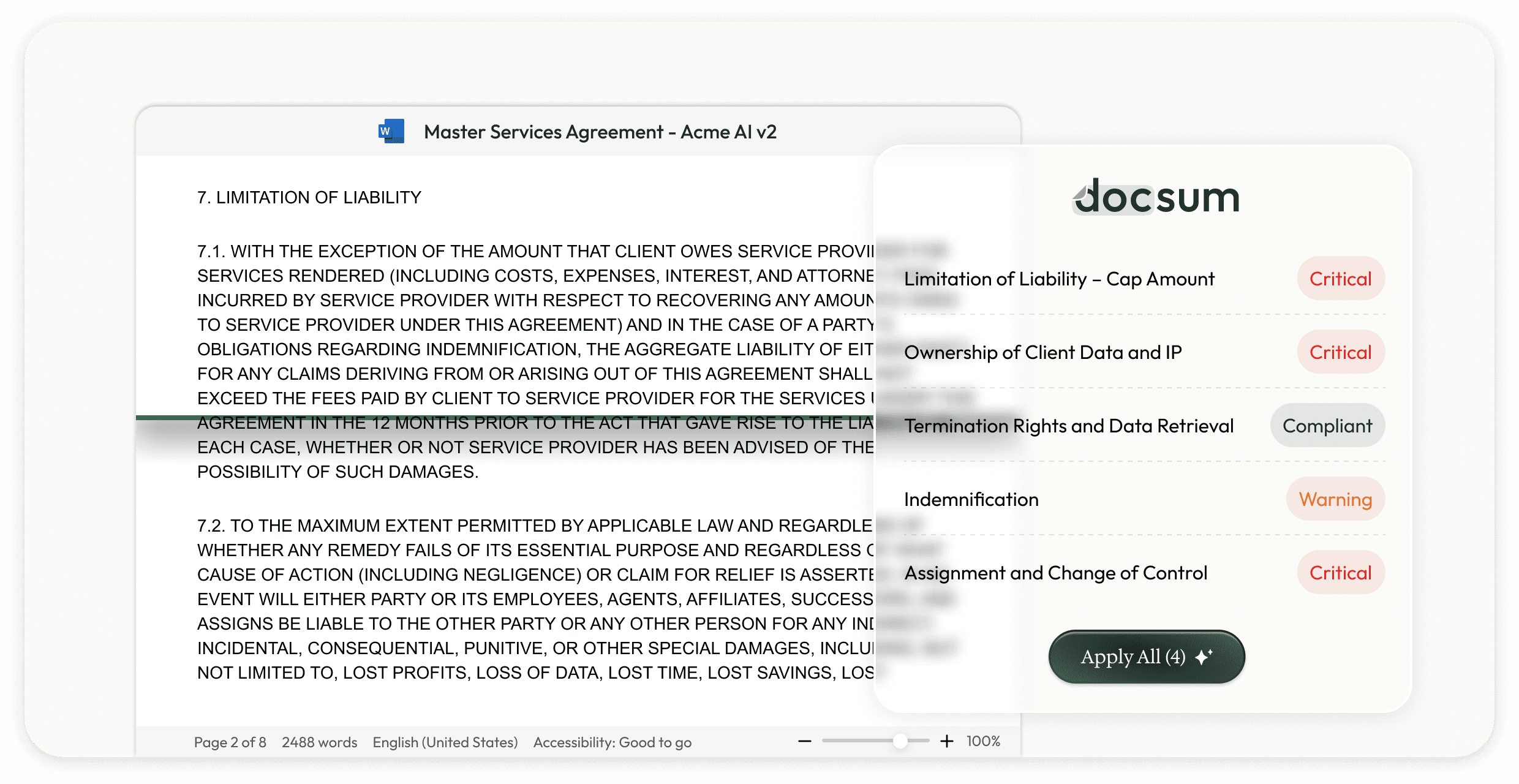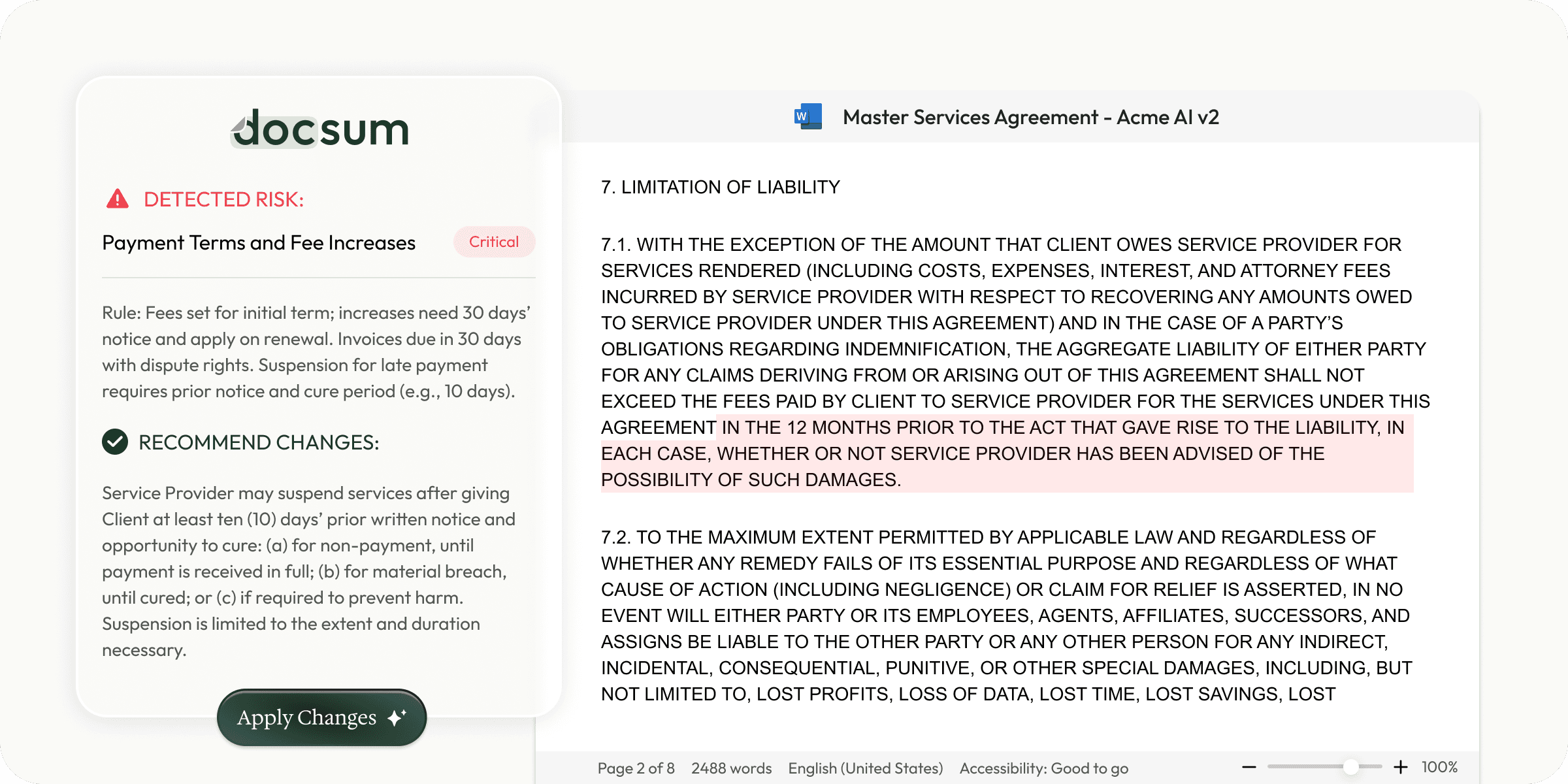 Use Docsum’s AI to instantly review key clauses, apply intelligent redlines, and respond faster than ever. Go from hours of manual edits to seconds of AI-assisted review while keeping full control.