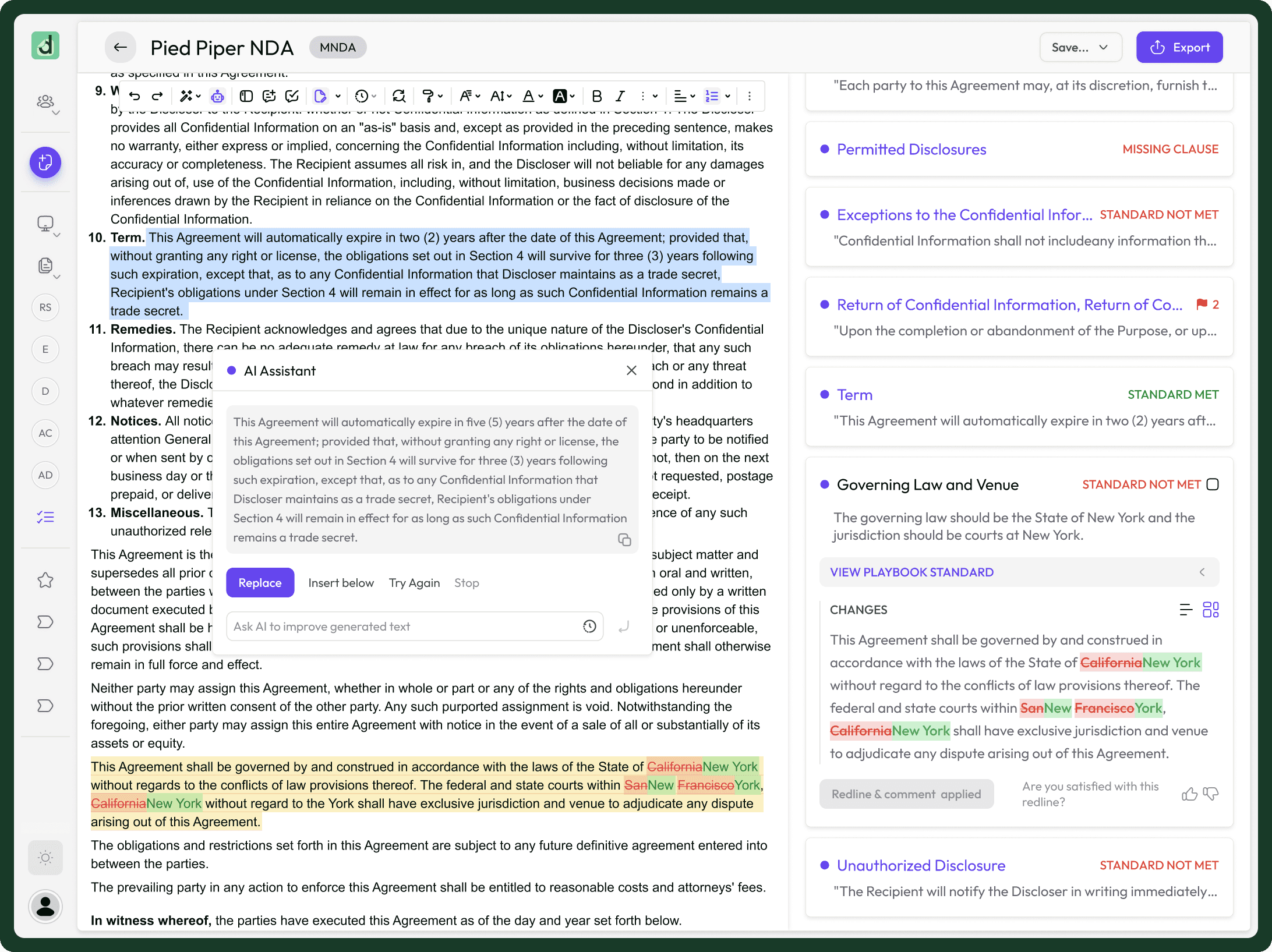 Confidently review contracts using playbooks built from your base contract templates and precedent.